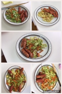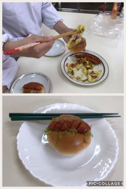 ニンジンやキャベツ切りでは、材料をニャンコの手にして押さえ包丁で切っていきます。包丁をうまく前に滑らせて切る児童もいれば、ステーキを切るナイフのようにギザギザと動かす児童もいました。最後は、おいしくホットドックをいただきました。