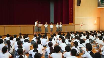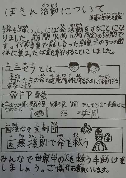 月曜日には中学校、本日は小学校の全校朝会にて、生徒会・集会委員会から「募金協力」の呼びかけを行いました。