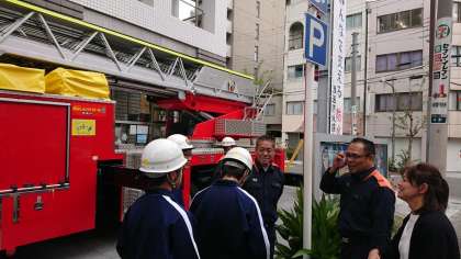 消防署チームは、はしご車を体験。