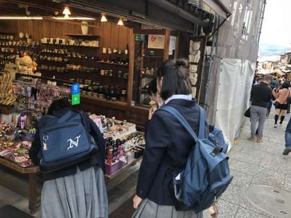 清水寺にて。 おみやげ屋さんで生徒発見! 協力して活動しています。