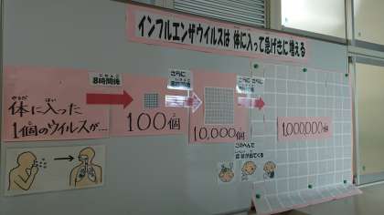 小学校の保健室前掲示板には、インフルエンザのこわさをわかりやすく掲示しています。