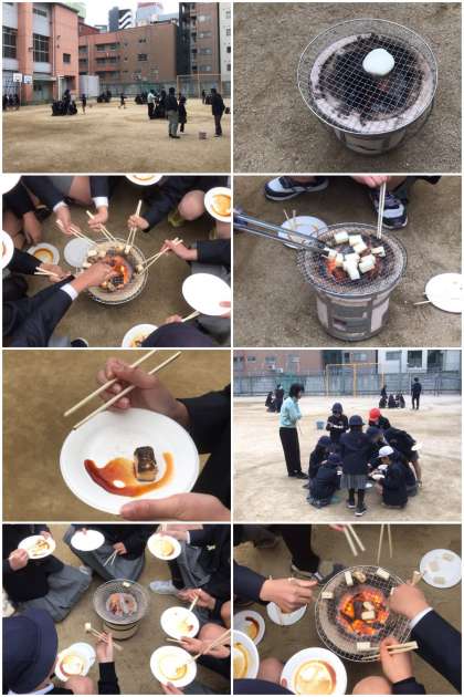炭に上手く火をおこし、お餅を焼きました。炎がきつく、少し焦げたりもしましたが子どもたちは、七輪を囲んで楽しく昔の人の暮らしを体験していました。