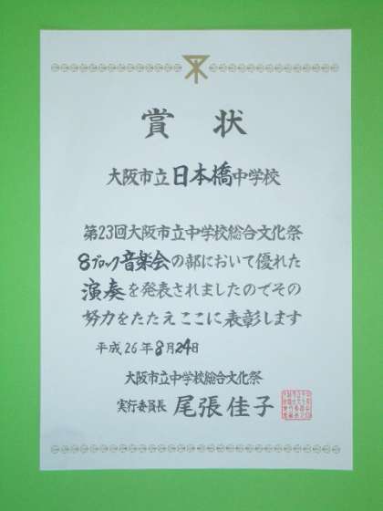 賞状と音楽室での練習風景を掲載しました。