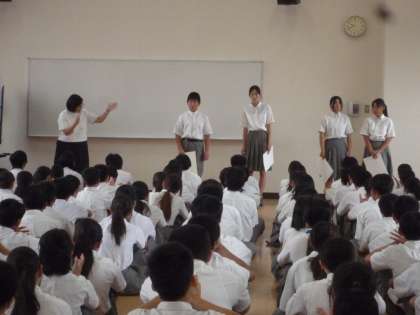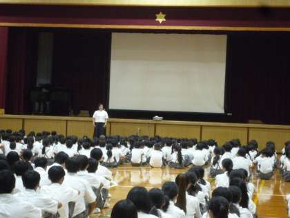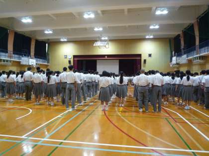 中学校の全校集会では、夏休み期間中のクラブ活動で優秀な成績を収めたバドミントン部と水泳同好会の表彰がありました。