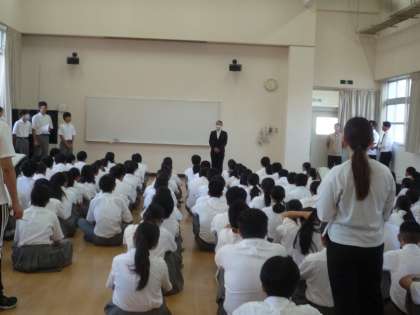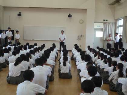 また、2学期から新たに着任した保健体育科の先生と、9月1日から22日までの教育実習生の挨拶がありました。