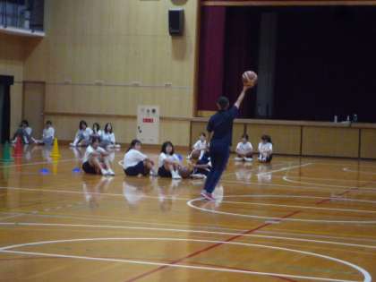 単元はバスケットボール、本時の目標は「レイアップシュートの形を理解する」で、準備運動、ドリブルのあと、4つのグループに分かれて練習しました。
