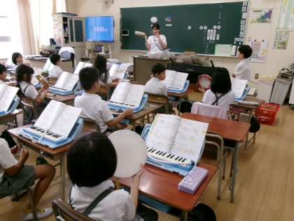 9月24日(水)1時間目、2年3組は音楽でタンバリンの持ち方、たたき方を教えてもらい、リズム打ちの練習をしていました。