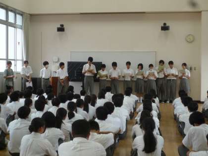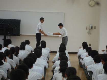10月3日(金)の文化祭に向けて、教頭先生からは「自分が頑張ることも大事ですが他の人と連携することが重要です。自力と他力を合わせて文化祭に取り組んでください。」とお話があり、生活指導の先生からは「文化祭の取り組みがうまくいっていないクラスもあると耳にしますが、クラス全員で力を合わせてください。」とお話がありました。