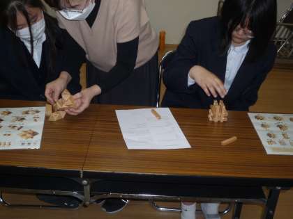 後半は、中国の木製のパズルのような鍵の組み立てに挑戦しました。複雑で難しい物もありましたが、みんな熱心に組み立てて楽しみました。