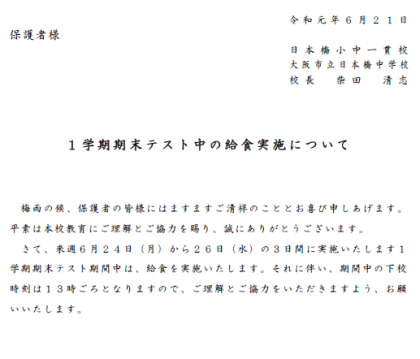 本日、中学生に下記のプリントを配付しています。 6/24(月)〜6/26(水)の...