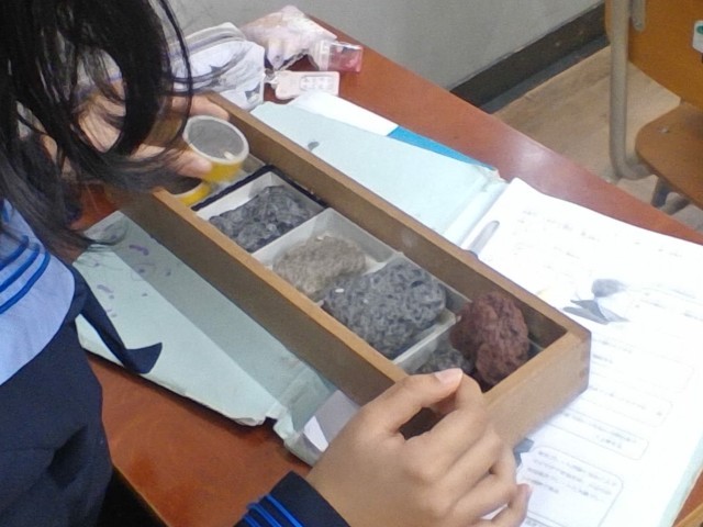 溶岩など、噴出物のレプリカを観察しています。