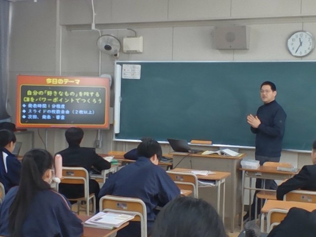 自分の好きなものを伝えるためのCMを学習者用端末を活用して、パワーポイントで作る実習に取り組んでいます。