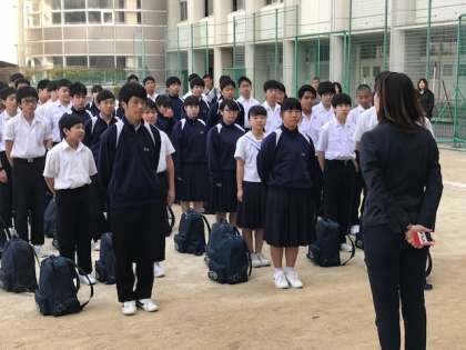 朝6時40分、グランドで修学旅行出発式が行われました。