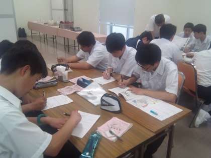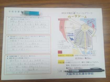時間に余裕ができたので、夕食前に今日一日の平和学習についての振り返りをしています。みんな、しっかり書いています。