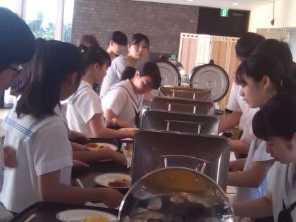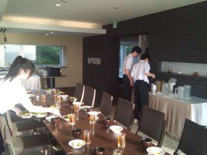 朝食はバイキング。時間を有効に使うため、食事係が希望のメニューを希望の量だけ入れてくれます。よく考えていますね。