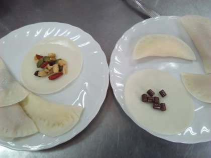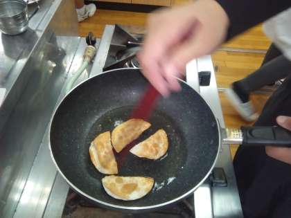 2年生が調理室で調理実習をしています。名付けて、『スナック餃子』だそうです。餃子の皮で、チーズ、ナッツ、ウインナー、チョコレートを包んでフライパンで焼きます。こんがりキツネ色に焼きあがり、とても美味しそうです。