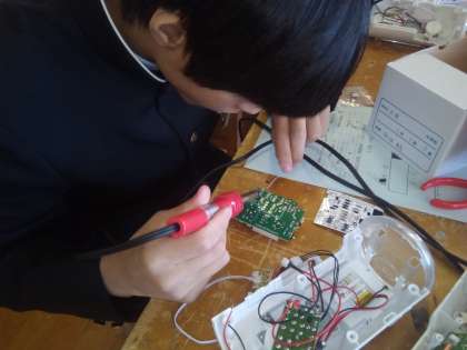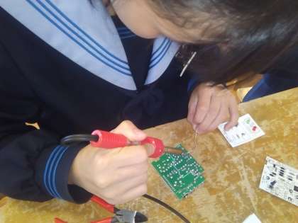 技術室では、2年生がラジオ制作実習をしています。細かいはんだ付けが難しそうです。図面通りに付けないと、音が鳴らないよ。集中して頑張れー。