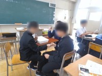 1年生の教室です。二人一組で会話の練習をしています。英語でいろいろな国の人と話ができるようになったら素敵だね。