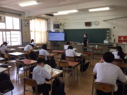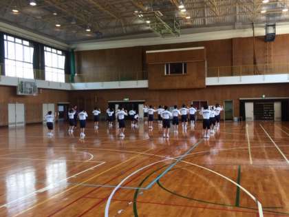 1日(月)から午前中3時間の授業を行っています。3年生の数学は約10名で分割授業を行っています。2年生の体育は男女に分かれて室内で行っています。