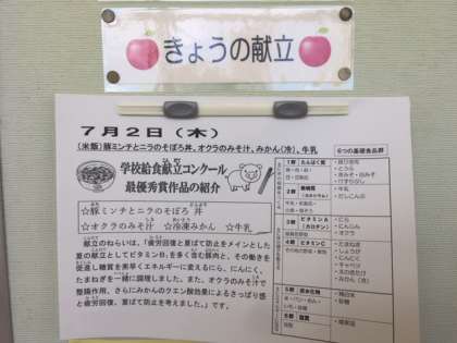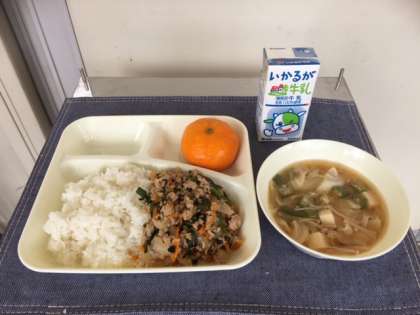 今日の給食は、豚ミンチとニラのそぼろ丼、オクラのみそ汁、冷凍みかん、牛乳です。学校給食献立コンクール、最優秀賞作品にかがやいた献立です。もちろん美味しくいただきました。