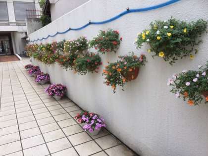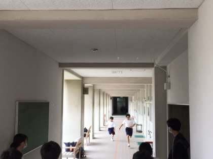 学校が完全に再開してから3週間が過ぎましたが、部活動も頑張っています。女子ソフトボール部は換気を十分にして広い室内で、陸上部は1階の廊下でトレーニングをしていました。玄関付近には、管理作業員さんが手入れをしてくれている花がきれいに咲き、雨の中、部活動に来た子どもたちを迎えてくれています。