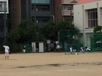 体育館では、男子バスケットボール部が汗を流していました。本校のグラウンドは、たいへん水はけがよいので、雨の合間に野球部はグラウンドで練習です。