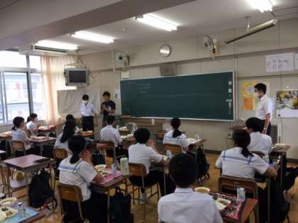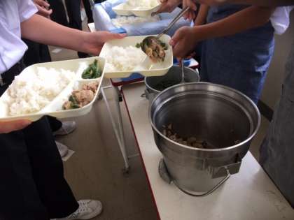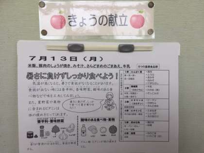 豚肉のしょうが焼き、ご飯、みそ汁、さんどまめのごまあえ、牛乳でした。みそ汁の中に入っていたカボチャやさんどまめは、体の疲れをとってくれるビタミンが豊富です。暑さに負けずにしっかり食べましょう!
