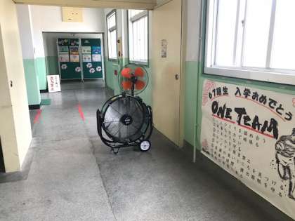 また、1年生のろう下には、新型コロナ感染症に対する予防策で、大型サーキュレータを導入しています。