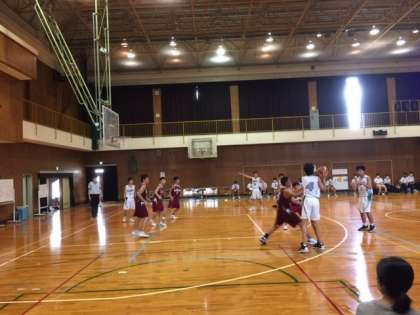〔写真はバスケットボール部の阿倍野中学校との試合の様子です。白いユニフォームです〕
