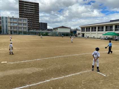 5日(土)の試合に勝った野球部は、6日(日)に友渕中学校と対戦しました。4校の合同チームのため、いっしょに練習することも少なかったのですが、最後までよく頑張りました。最終回の2アウトまで、0対5で負けていましたが、本校3年生のランニングホームランで1点を取り、意地を見せてくれました。試合には負けましたが、いいゲームでした。猛暑の中、本当にお疲れ様でした。
