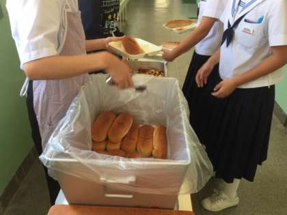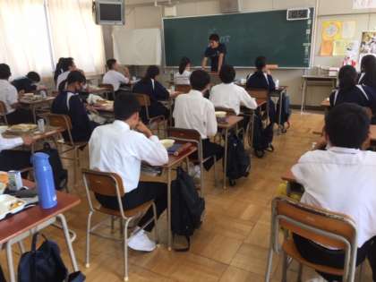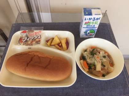 献立は、豚肉といかの中華煮、大学いも、アーモンドフィッシュ、黒糖パン、牛乳です。