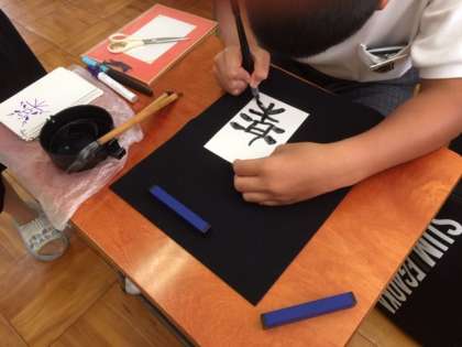 今日は、住吉区の中学校から来ている男子生徒が、文化祭に向けて習字を行っていました。上手に「楽」という漢字が書けました。