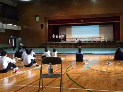 写真上は、3年生(格技室)、写真下は、1年生(体育館)の様子です。