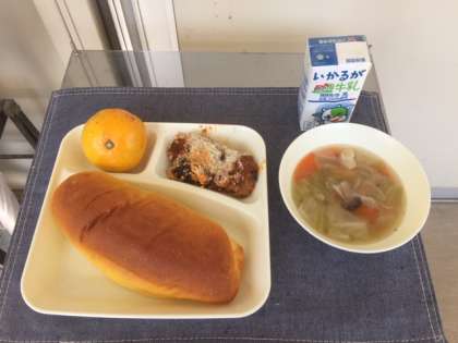今日の献立は、なすのミートグラタン、鶏肉と野菜のスープ、みかん、パンプキンパン、牛乳です。どのクラスもほぼ完食です。1年生は、みかん争奪のじゃんけんを行っていました。