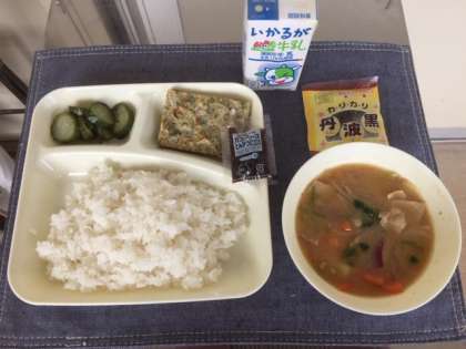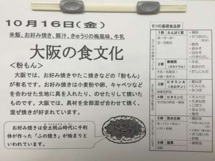 今日は、お好み焼き、ご飯、豚汁、きゅうりの梅風味、牛乳という献立、「The 大阪」です。お好み焼きと白飯、どちらも炭水化物ですが、子どもたちは、ペロッと食べていました。