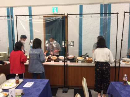 バイキング形式ですが、ホテルの方に取っていただきます。間にビニールシートが張ってあります。ドリンクを入れる場合は、ビニール手袋をしてのセルフサービスです。