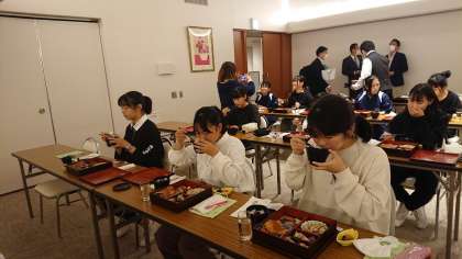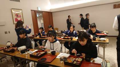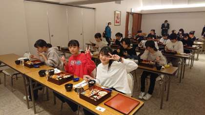 同じ方向を向いての食事ですが、仲間といっしょなので楽しく食べられます。