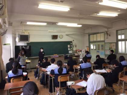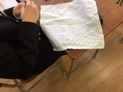 コロナ禍の中、調理実習等がなかなかできません。前を向きしゃべらずに、ふきんを縫っています。すごい集中力です。