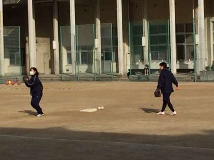 女子ソフトボール部はベース上で素早くボールを回しています(写真中)