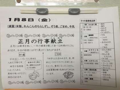 今日の献立は、お正月の行事献立、れんこんのちらしずし、ぞう煮、ごまめ、牛乳です。寒い中、熱々の献立のおかげで体も温まります。