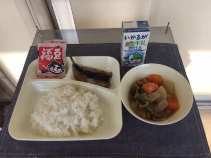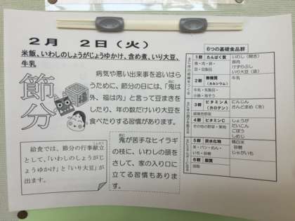 節分の行事献立、いわしのしょうがじょうゆがけ、含め煮、いり大豆、ご飯、牛乳です。福(ふく)が来ますように。