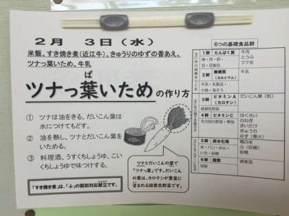 今日の献立は、すき焼き煮、きゅうりのゆずの香あえ、ツナっ葉いため、ご飯、牛乳です。すき焼き煮のお肉は、なんと近江牛です♪美味しくいただきました。
