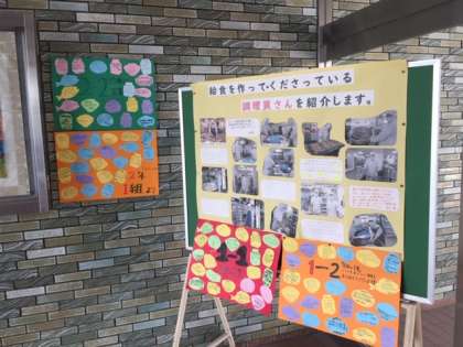 玄関の内側に、文化祭で展示した給食調理員さんの写真とコメントをもう1回掲示しています。普段、マスクを着用しているので、なかなかお顔がわかりませんが、感謝の気持ちでいっぱいです。いつも本当に美味しい給食をありがとうございます。