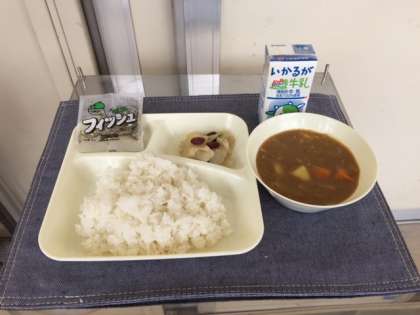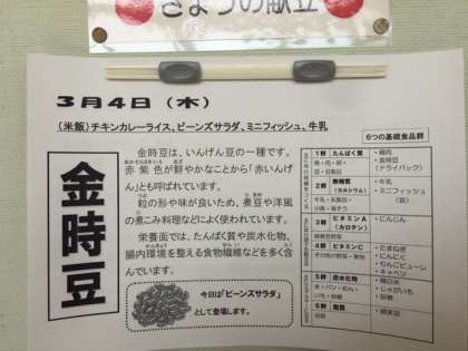 4日(木)の献立は、チキンカレーライス、ビーンズサラダ、ミニフィッシュ、牛乳です。3年生は今日を入れて給食も後4回となりました。美味しい給食ありがとう♪