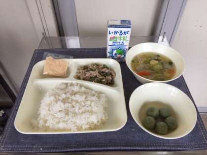 献立は、米飯、豚肉と野菜のいためもの、すまし汁、きな粉よもぎだんご、牛乳です。美味しくいただきました。