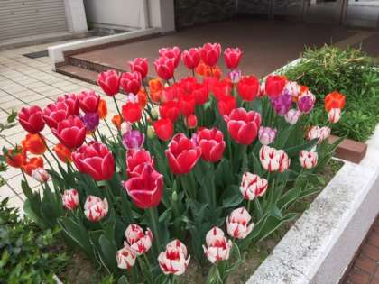 写真は、今朝の雨が降る前の玄関前のチューリップです。