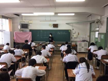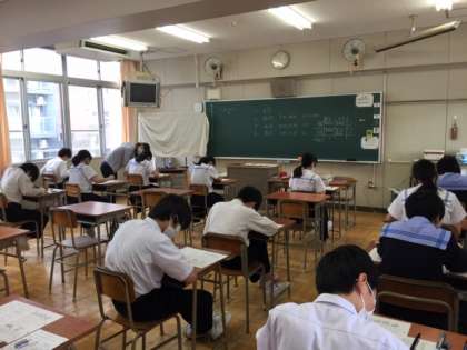 20日(木)確認(中間)テスト実施中です。授業時数が少ないので、試験範囲を狭(せば)めて、1限を40分(1年生は35分)で行っています。どの学年も集中してテストを受けています。