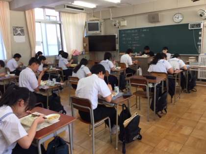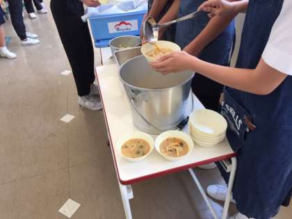 献立は、鶏肉のおろしじょうゆかけ、みそ汁、野菜いため、ごはん、牛乳、ソフト黒豆です。和風の給食を美味しくいただきました。今日も生徒会役員が音楽を流してくれて、いい雰囲気の中食べることができています。