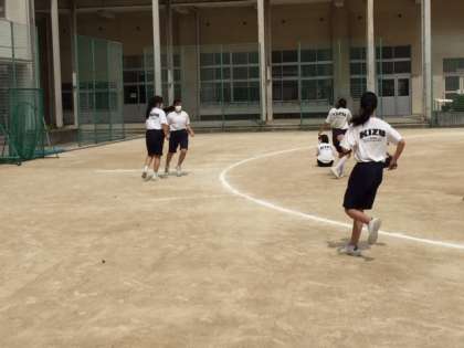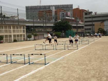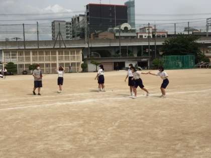 3年生の授業の様子です。男子はハードル走、暑い中、頑張っています。女子は最後に後ろ向きリレーを行いました。結構、接戦で盛り上がりました。