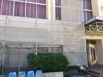 本校の体育館が避難場所になった時のために、体育館に空調設備をつける工事をしています。体育館横に足場ができています。